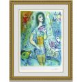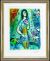 シャガールの「サーカスファンダンサー」は、大きく描かれた踊り子の引き締まった表情と、彼女を包み込む緑色の光があいまって、舞台の緊張感が良く伝わって来る絵に仕上がっています。絵の左上の赤い服を着た人は踊り子を際立たせる脇役です。右側の美しい花束を持った男性は、踊り子が如何に魅力ある人物なのかを良く伝えています。また男性は左側の鳥と向かい合って描かれており、その構図が舞台の張りつめた空気をより強くしていると言えるでしょう。絵の背景には楽器を演奏する人たちが居て、サーカスで奏でられる音楽が聴こえてくるようです。踊り子は、くびれた腰つきで赤色や黄色で強調して描かれています。さらに紫の扇を胸に当て、構えている様子は、彼女が存在感のある優れたダンサーであることを表しているのでしょう。文化教室の施設、またダンス教室に飾るのに相応しい絵画です。踊り子の真剣な眼差しから、舞台を成功させる力を得られそうな作品となっています。