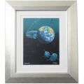 ウィリアム・シンメルの「イルカ」は、4頭のイルカをユニークなシチュエーションで描いた作品です。海中かと思いきや、地球のモチーフが描かれており、まるで広い宇宙をイルカが泳いでいるかのようなファンタジックな世界に引き込まれていきます。イルカたちの表情は一様ににこやかで、愛らしく笑っているように見え、心が和む作品です。一見クジラにも見えるくらい、ぷっくりと太った中心のイルカはことさら愛嬌があります。色使いは紺や青が基調となっており、派手さはないものの、地球儀の黄色がアクセントとなり、イルカの表情と相まって楽し気な作品となっています。リビングや寝室、カフェやレストランなど、どんな場所にでも合い、万人に好まれるアート作品です。