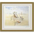 サルバドールダリの「コズミックホースマン」は馬に乗った人物とその風景を、繊細で美しいタッチで描いた作品です。ダリの作風も様々あり、ダイナミックで力強い作品が多い中、風景画のような美しい作品に仕上げられた珍しい一作といえます。もちろん、歪んだ時計のような物体や、勇ましく鬣をなびかせる美しい馬の姿などダリらしさも随所に垣間見れます。地面の薄いベージュや空のうっすらとした青の色使いがとても美しく、落ち着きと安らぎを与えてくれます。目の前に佇む人物が目に入りやすいですが、後ろの山々まで細かく描かれているアートな点も見逃せません。一番前に赤と黒の花を配置しているのも、素人には考え付かないダリのアート魂を感じる作品となっています。