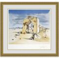 サルバドールダリの 「パラノイク・ヴィレッジ」は、戦いに敗れた跡のように石門が崩れ落ちたままのうらびれた村の様子を描いた作品です。崩れ落ちた石門だけを見ると悲哀に満ちた印象を受けますが、門の番人をしている羽を付けた悪魔は眠りこけており、門の向こう側には赤いドレスを着て縄跳びをする少女の様子や、幾人かの人影が見えます。崩れた門とは対照的に、村はのどかな平穏を取り戻しているようです。細かな描写だけではなく、このアート作品は構図と色使いの美しさも際立っています。突き抜けるような澄んだ青空に薄いベージュの建物、奥に静かに佇む教会や遠くの山々がキレイです。点在する人影や手前の悪魔のような番人もアクセントとして加わり、とても美しい光景が描かれているといえるでしょう。