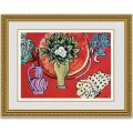 マティスの有名な絵画「マグノリアのある静物」は、色のコントラストだけではなく、置いてある静物の配置のユーモラスささえも感じさせられます。木蓮や泰山木の総称であるマグノリアの花を一輪飾り、その後ろになぜか鍋を配置いているため、平面的な中にもどこか遊び心を感じさせるのです。作品全体のカラーが赤と緑という相反する色でありながら調和が取れているので、見ているものに自然な形で元気と活力を分けてくれます。ご自宅のリビングや食堂に飾っておくのもいいですし、レストランなどの入り口に飾っても映える作品です。飾ってある作品に元気を分けてもらい、食欲増進にも一役買えることでしょう。派手な色彩でありながら、主張しすぎることのない作品です。